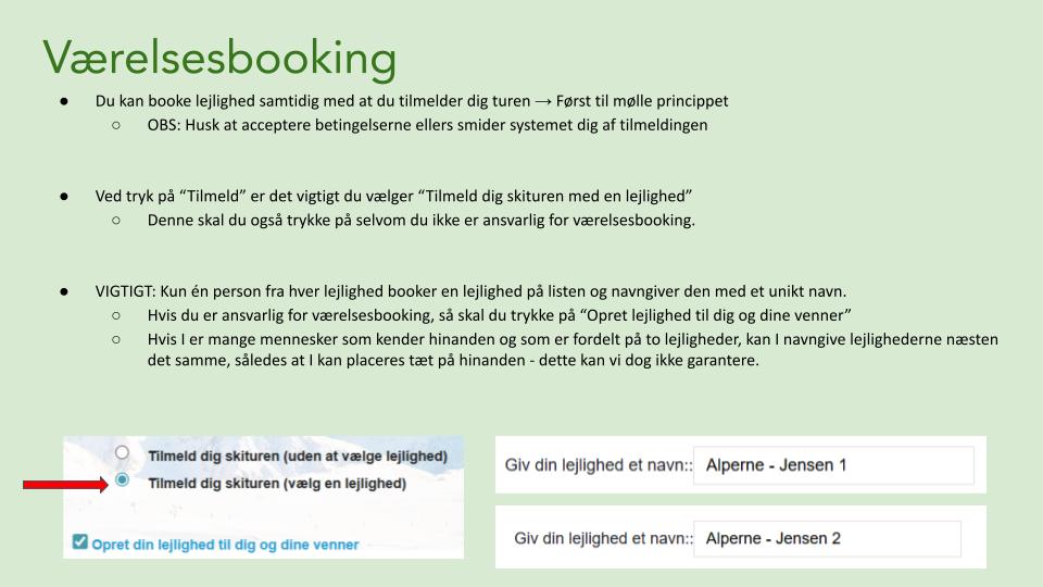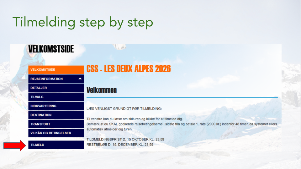 Tilmelding 2026 Info slides: Klik på knappen nedenfor for at downloade info slides om turen til Les Deux Alpes og læs mere om hvordan tilmelding foregår: Download info slides Tilmelding Step by step: 1. Find link til tilmelding på Instagram her eller Facebook her. 2. Vælg: “Tilmeld“ 3. Vælg: “Tilmeld dig skituren (vælg en lejlighed)” 4. Én person opretter værelse og resten melder sig derefter på dette værelse 5. I vælger de tilvalg I ønsker (disse kan rettes indtil 15. december) 6. Du betaler 1. rate indenfor 48 timer på 2.000,- 7. Du går og glæder dig til turen 8. Du betaler 2. rate (restbeløbet) den 15. december) Værelsesbooking: Læs mere nedenfor Har du nogle spørgsmål? Så skriv lige til os, vi sidder klar på tasterne. Spørgsmål? Slide i vores DM Værelsesbooking: Step by step